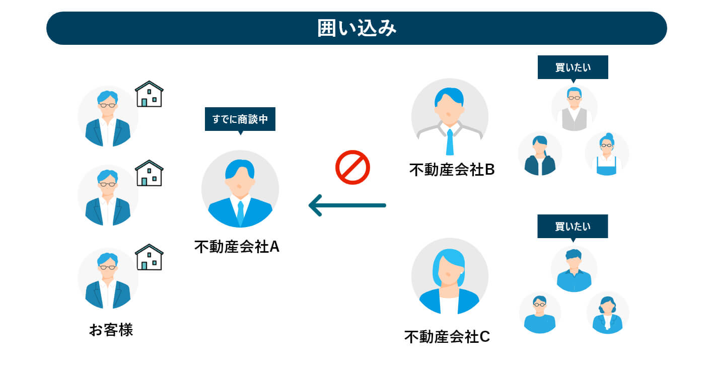 しかし不動産会社の中には、他社からの買主様の紹介を断ったり、情報の公開を制限するなどして、買主様を自社だけで探そうとするものがいます。売主様と買主様の双方から報酬を得られる【両手仲介】を目指しているからです。そのための行為を【囲い込み】といいます。