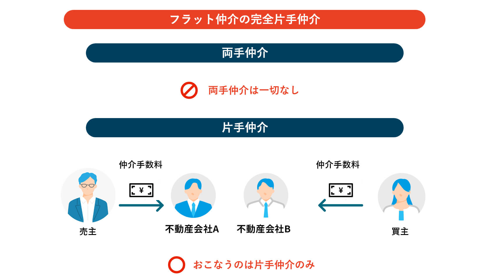 フラット仲介は、両手仲介を一切おこなわず、片手仲介をおこなう「完全片手仲介」にこだわっています。