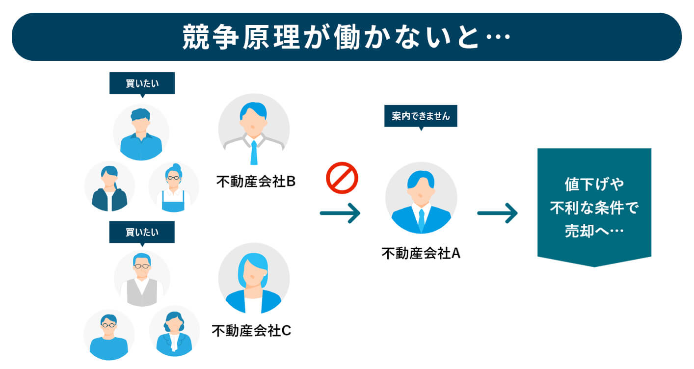 私たちは、不動産取引こそ、『適正な市場競争』によって価格が決まるべきだと考えています。競争原理を働かせることで、売主様の利益を最大化することが正しい取引のあり方だと信じています。