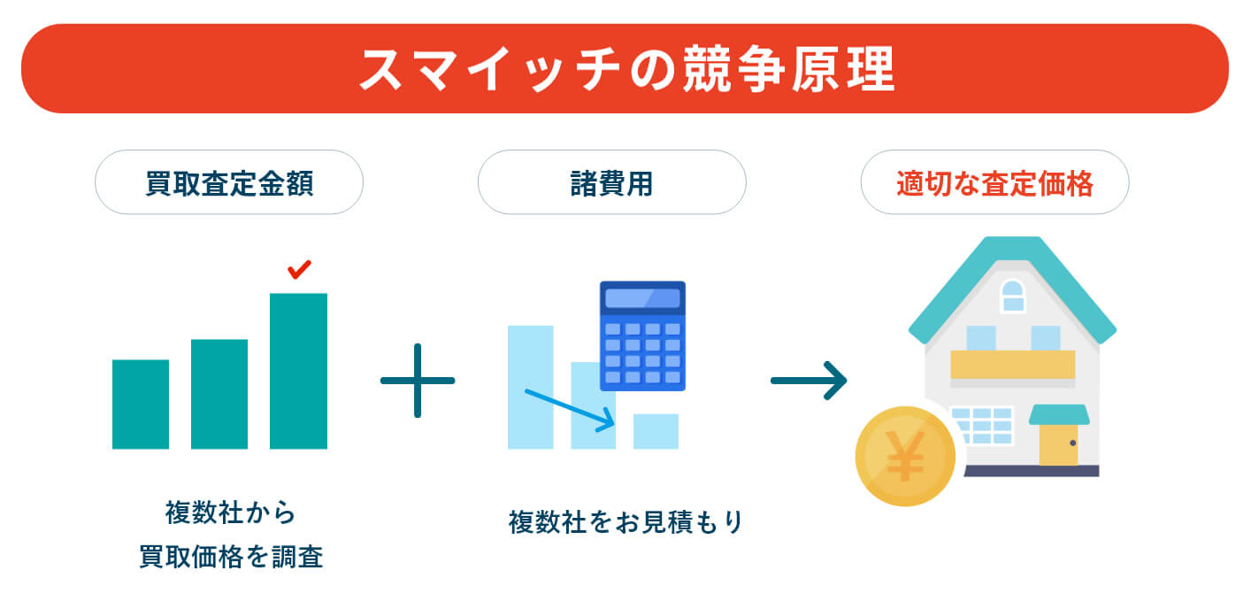 スマイッチでは、自社での査定はもちろん、大手を含む複数の不動産会社の買取査定金額を同時に調査します。複数の査定内容を比較し『競争』させることで、『適正な販売価格』を決めることに役立ちます。売主様専属エージェントとして、納得して売却を進めて頂くために、この仕組みを考えました。